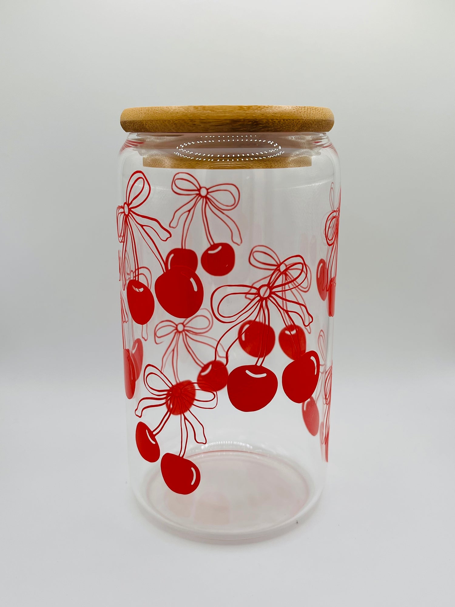 Glass cups with wood lid and glass straw, and permanent vinyl design....