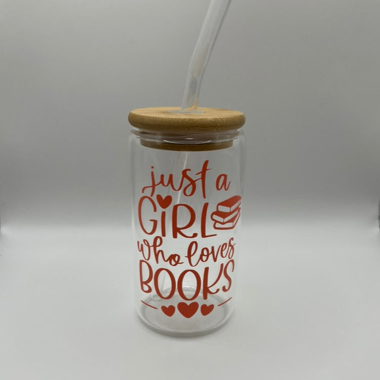 16 oz Just a girl who loves books Ice Coffee Glass Cup - Libby Beer Glass - Glass cup with Banboo Lid - Iced Coffee Glass with Straw